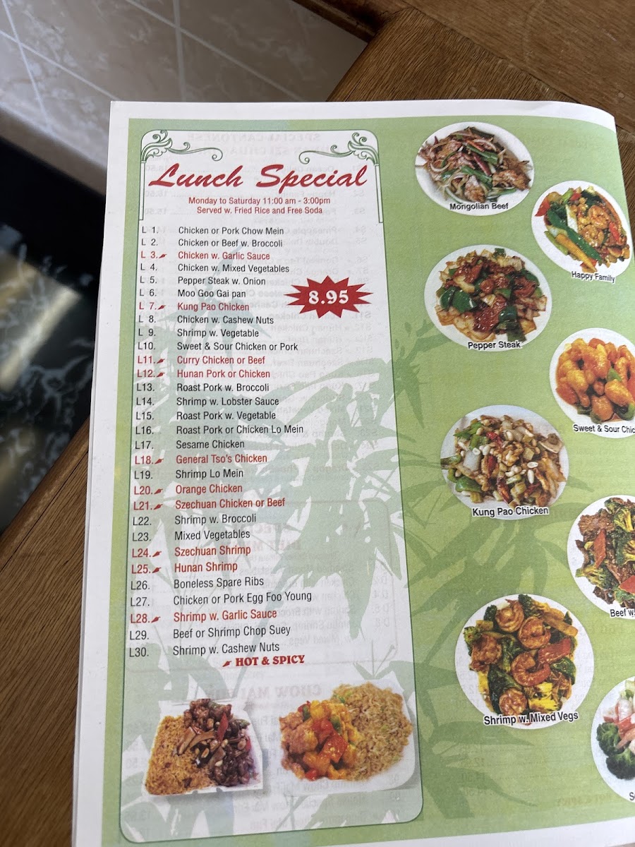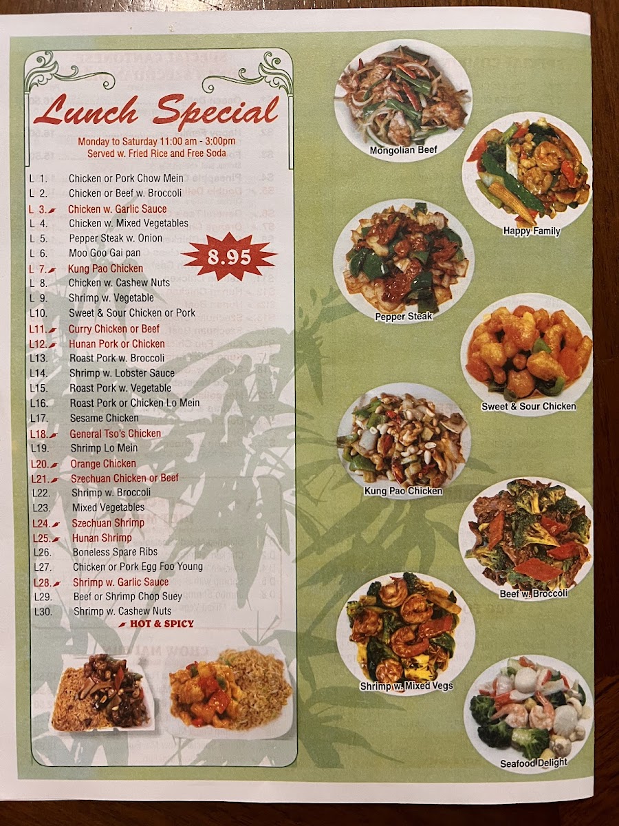 - A variety of stir-fried dishes offer a balance of textures and subtle spice, like Kung Pao Chicken and Hunan style pork or chicken.