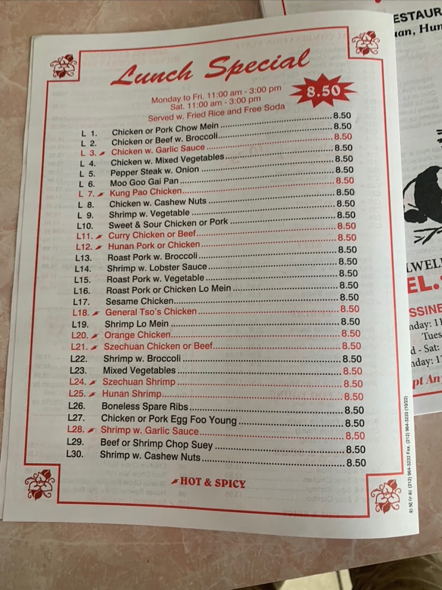 Hunan Chinese Restaurant Menu